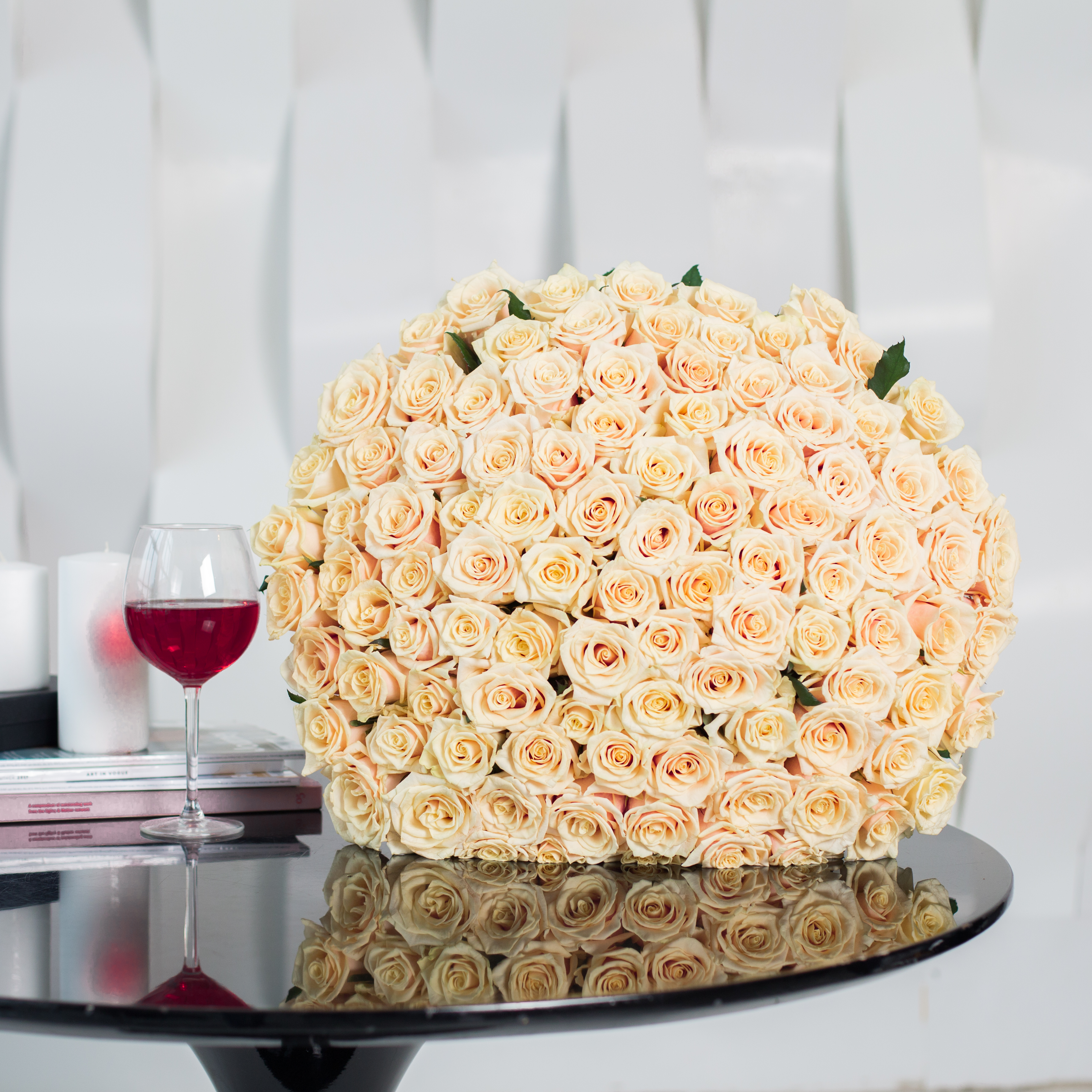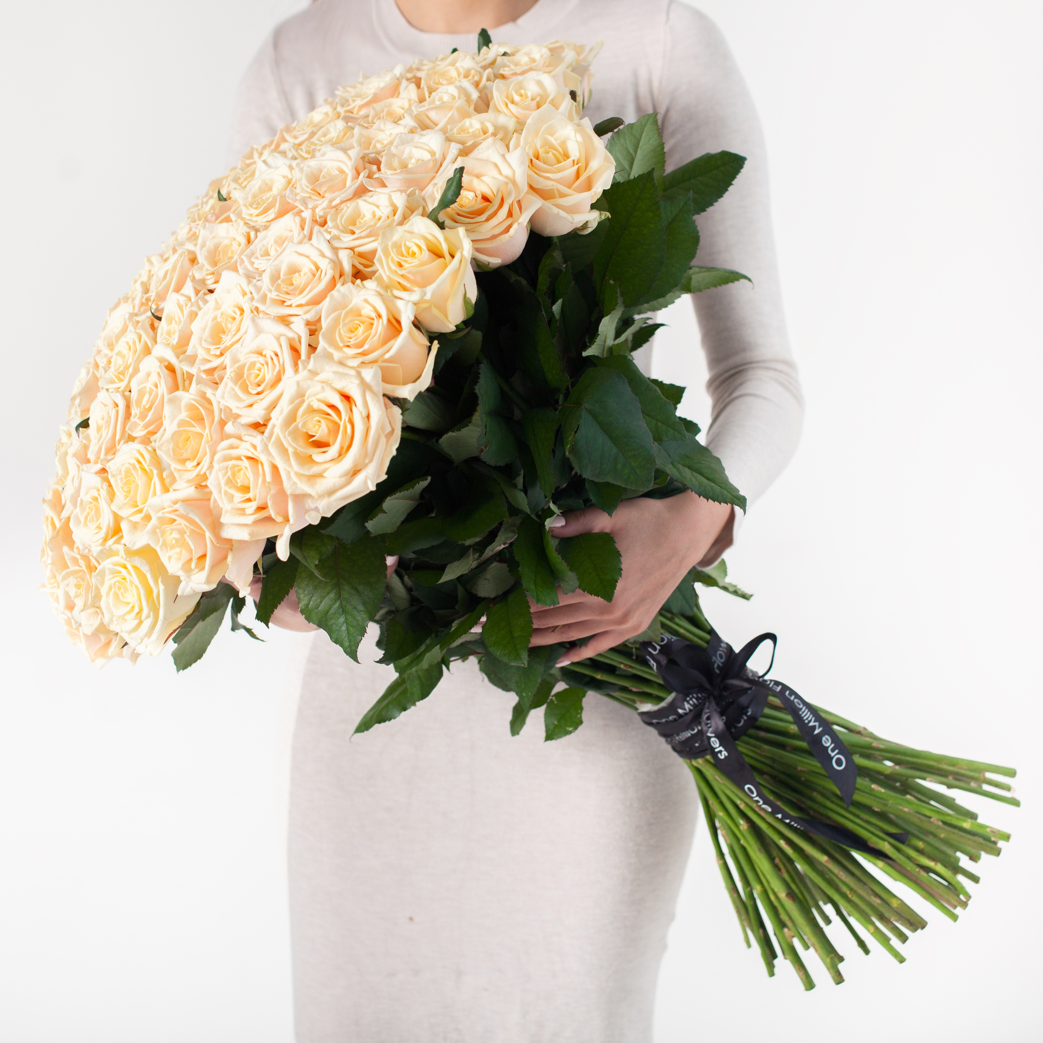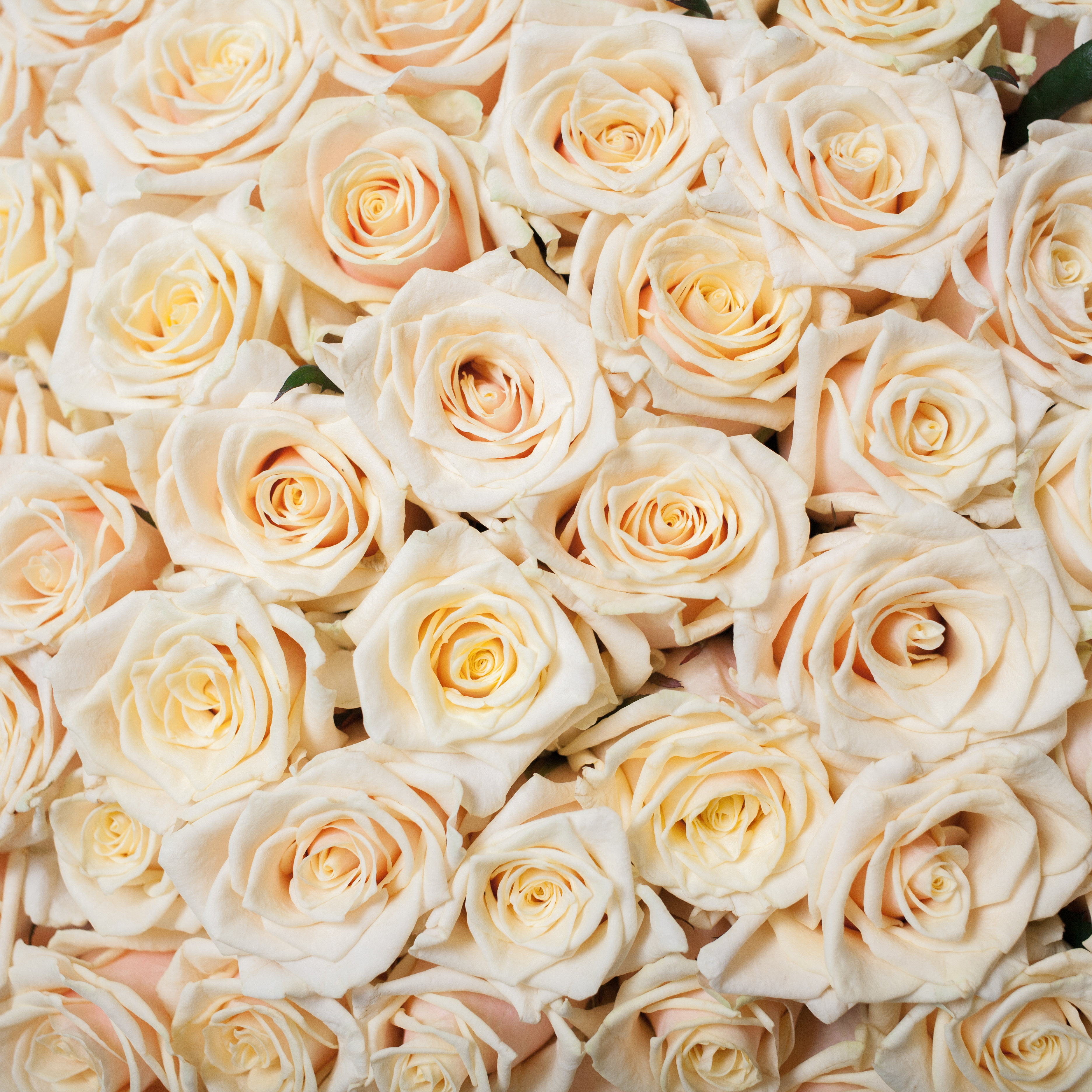 Преимущества этого букета просто не перечислить! Кремовые розы имеют потрясающую текстуру лепестков, что придает им естественную прелесть. Богатство окраски цветка добавляет особый шарм каждому бутончику. Столь обширное количество роз делает этот букет поистине феноменальным произведением искусства.