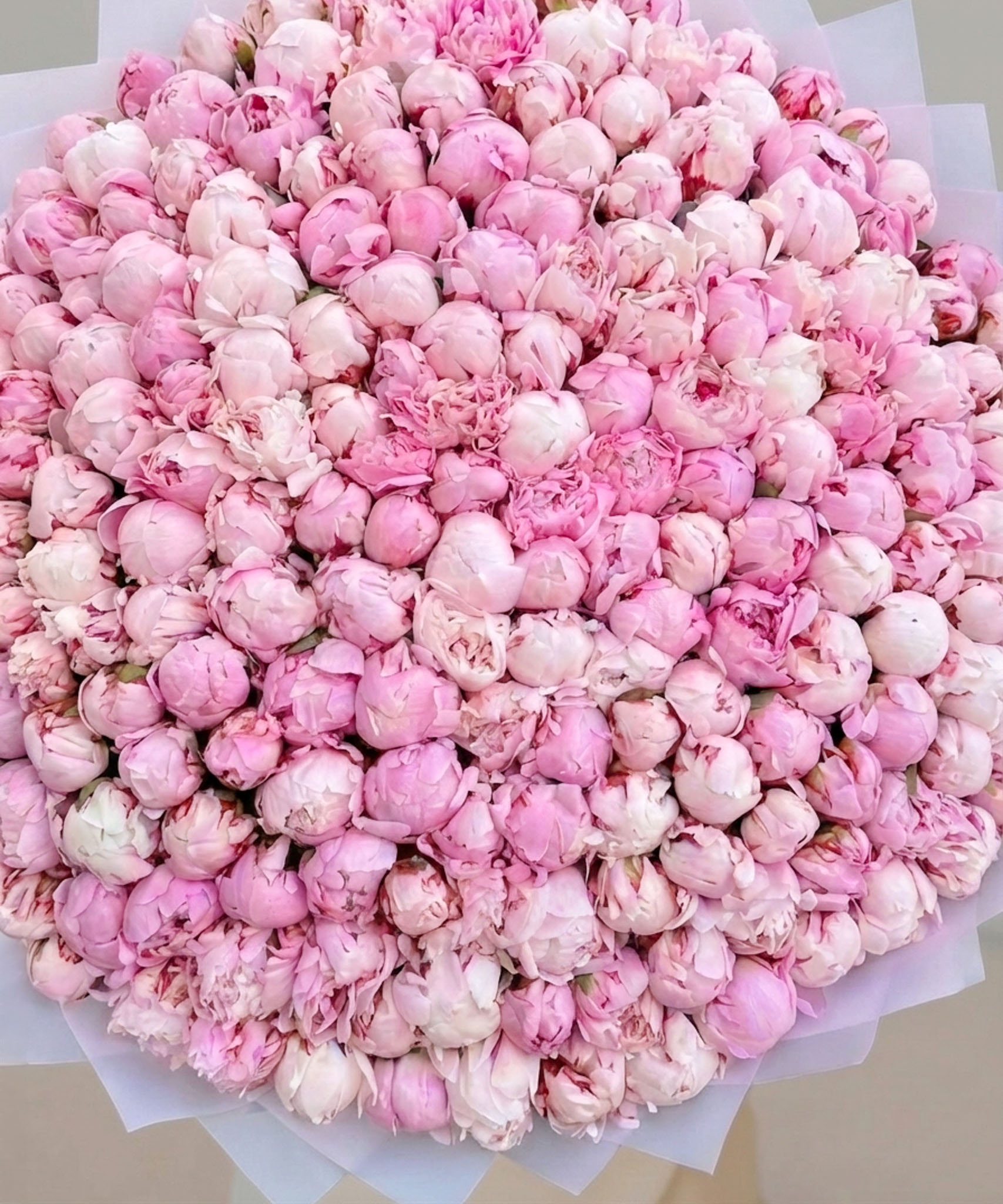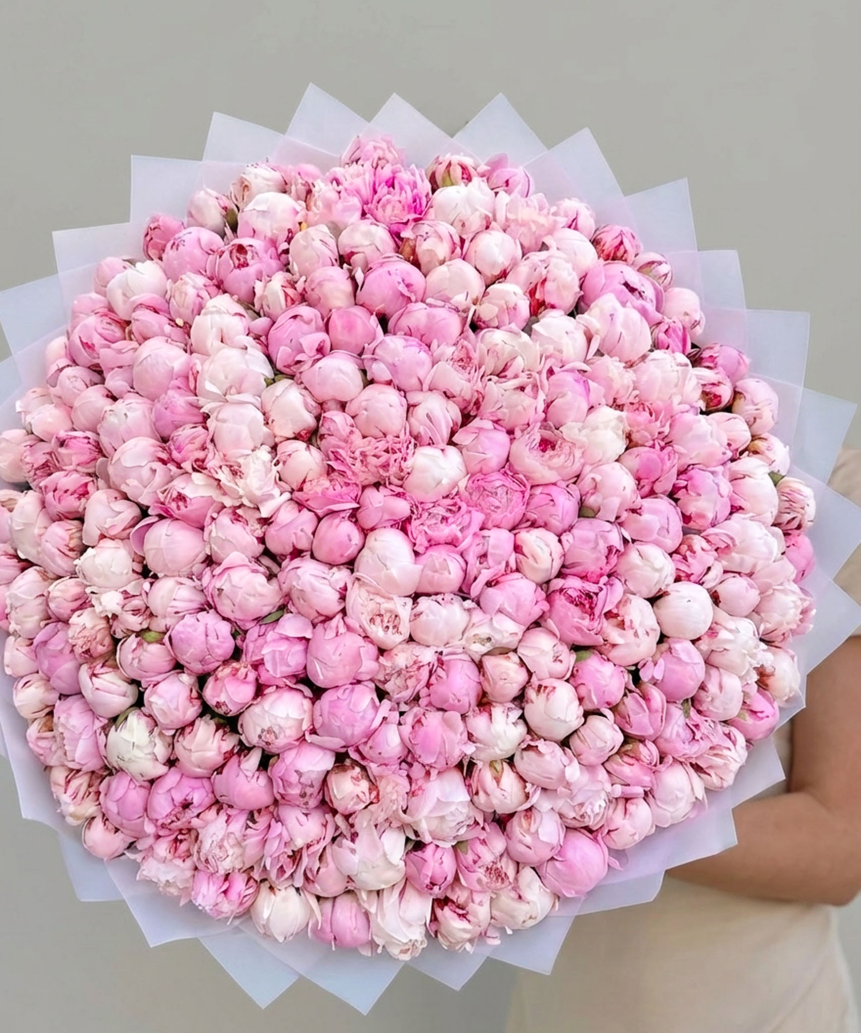 Этот огромный букет пионов состоит из 151 нежнейшего розового пиона сорта "Сара Бернар". Каждый бутон – это пушистое облако изысканных лепестков, раскрывающихся в роскошные, ароматные соцветия. 151 розовый пион, собранный в единую, пышную композицию, создает поистине впечатляющий объем и невероятную плотность цвета. Это настоящее море нежности и красоты, которое мгновенно приковывает к себе все взгляды, наполняя пространство изысканным, неповторимым ароматом.