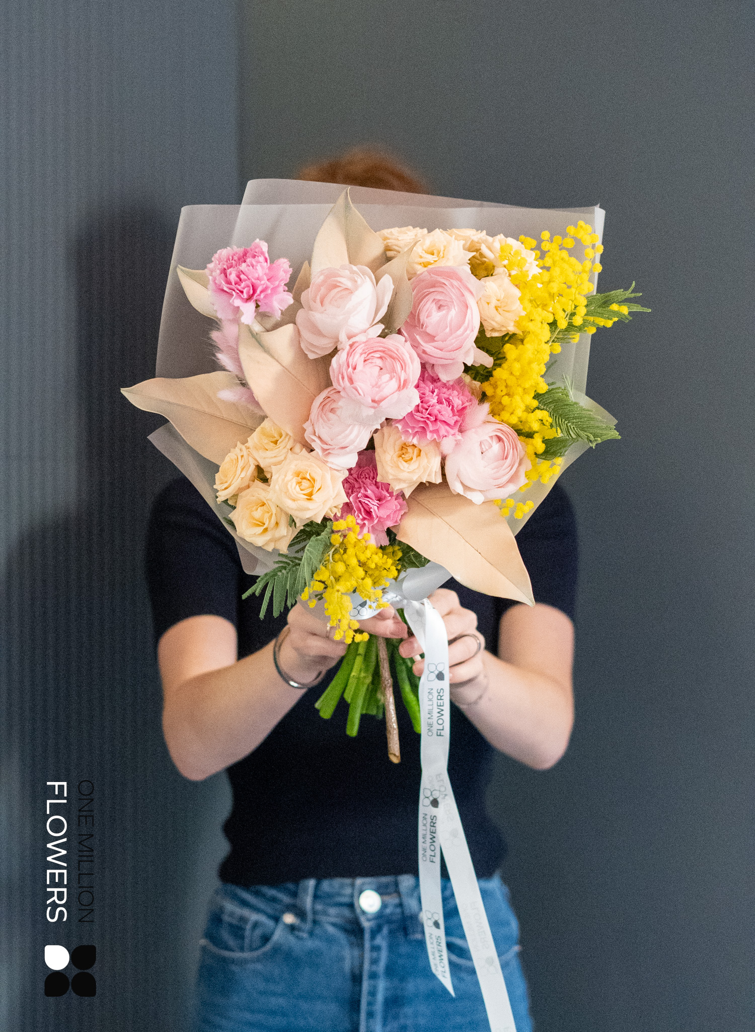 В букете "Нейми" Mate вы найдете: 5 розовых ранункулюсов, 3 кремовых диантуса (гвоздики), 2 мимозы, 3 кустовые розы Свит Сара (кремовые) и 1 магнолию. Каждый элемент был тщательно выбран для создания идеальной композиции. Ранункулюсы с их нежными лепестками и гвоздики придают букету изысканный шарм. Мимоза добавляет легкость, а кремовые розы олицетворяют элегантность и праздничное настроение.