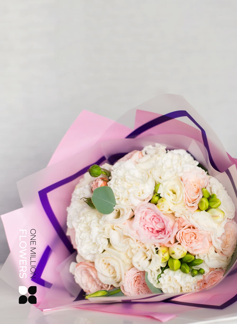 - Диантус белый (Гвоздика) — 11 шт. - Фрезия белая — 6 шт. - Пионовидная роза Пинк Охара — 4 шт. - Эустома Белая — 4 шт. - Роза кустовая Бомбастик Кремовый (нежно) — 9 шт.