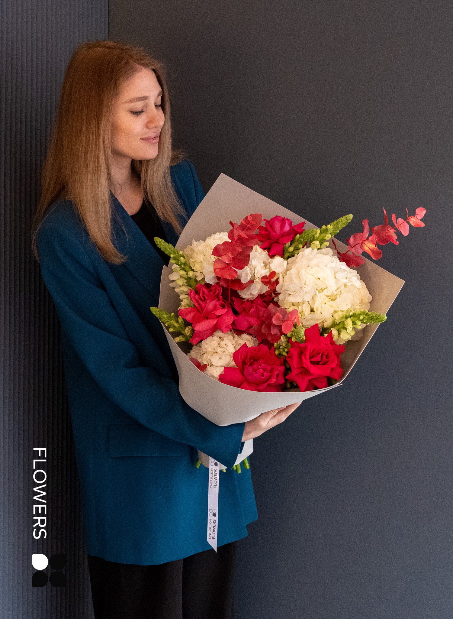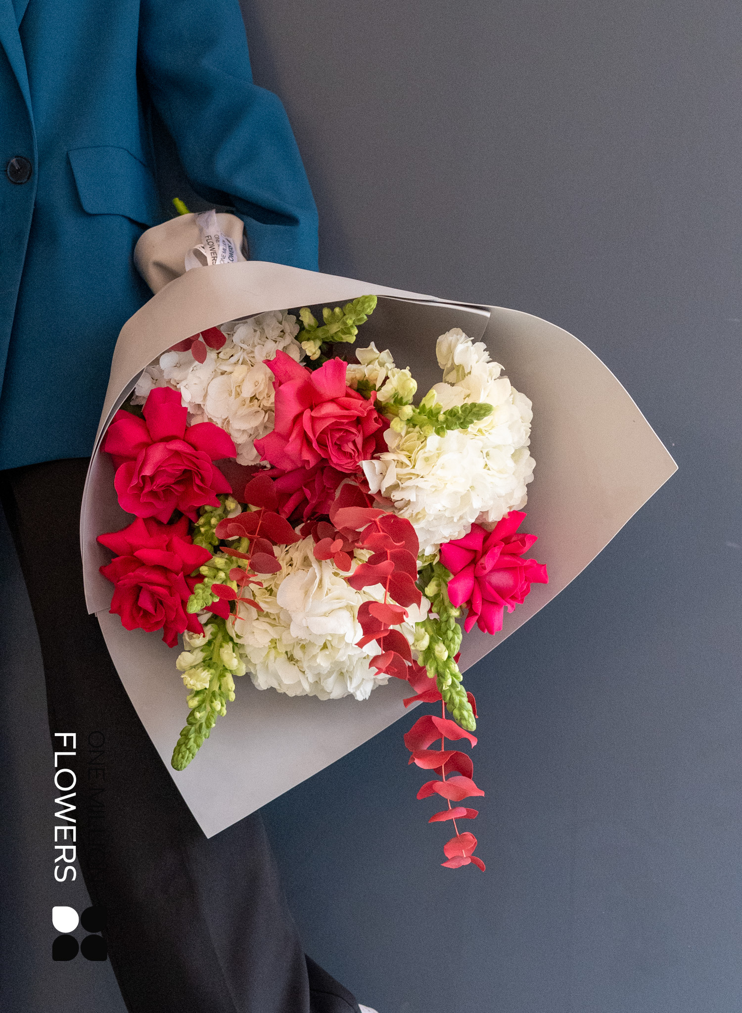 "Салун Пинк" Grey — это тонкий баланс между нежностью и сдержанным стилем. В составе: розовые кустовые розы, ранункулюсы, эустомы и сезонная зелень, обёрнутые в дизайнерскую бумагу серого цвета. Такой букет словно вырван из модной фотосессии: он минималистичен, элегантен и подчёркнуто современный. Оттенки розового будто подсвечиваются серым фоном, придавая композиции глубину и лёгкую драматичность.